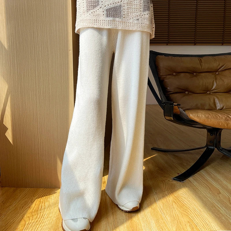 Women's autumn and winter 100% Merino Wool Sprout Leg Pants High Waist Straight leg Casual Knitted Pants Loose Outer Wool Pants
