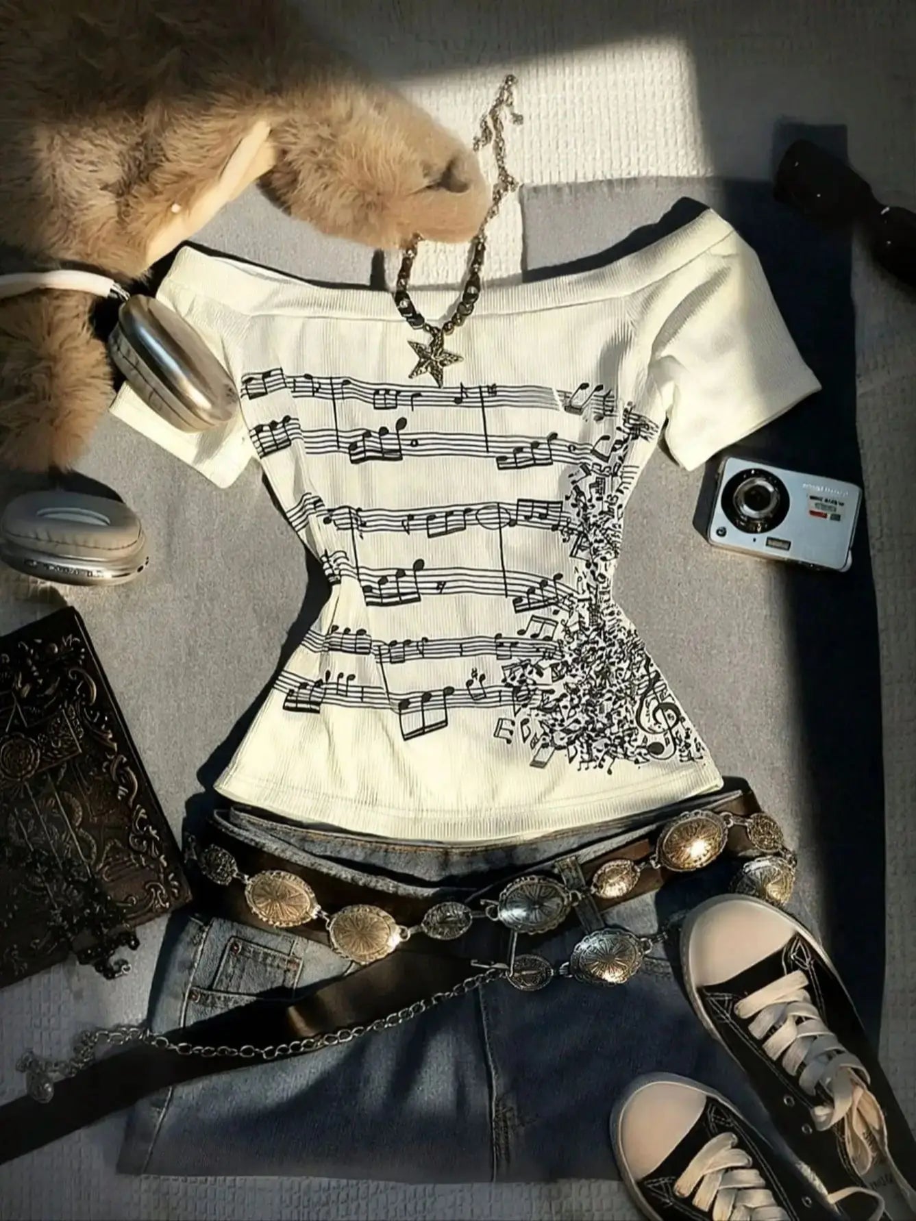 Women's Retro Off-Shoulder Long-Sleeved Slim-Fit T-Shirt, Adorned With Musical Note Print, Fashionable, Y2K Retro Style, High-Qu
